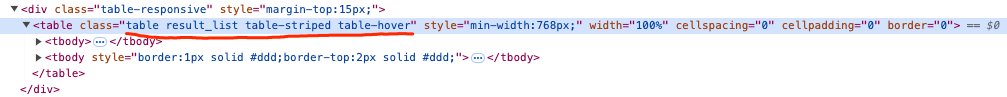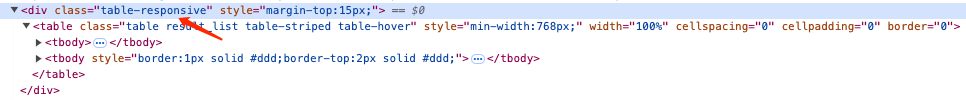 观察一下上面的 HTML 结构,table 表格的最外层有一个 div,它还有个 class 属性:table-responsive,假设这个 div 的 class 属性是整个 HTML 里独一无二的,那么我们就可以很放心的去查找 div.table-responsive 下的 table,进而准确定位我们想要的元素。