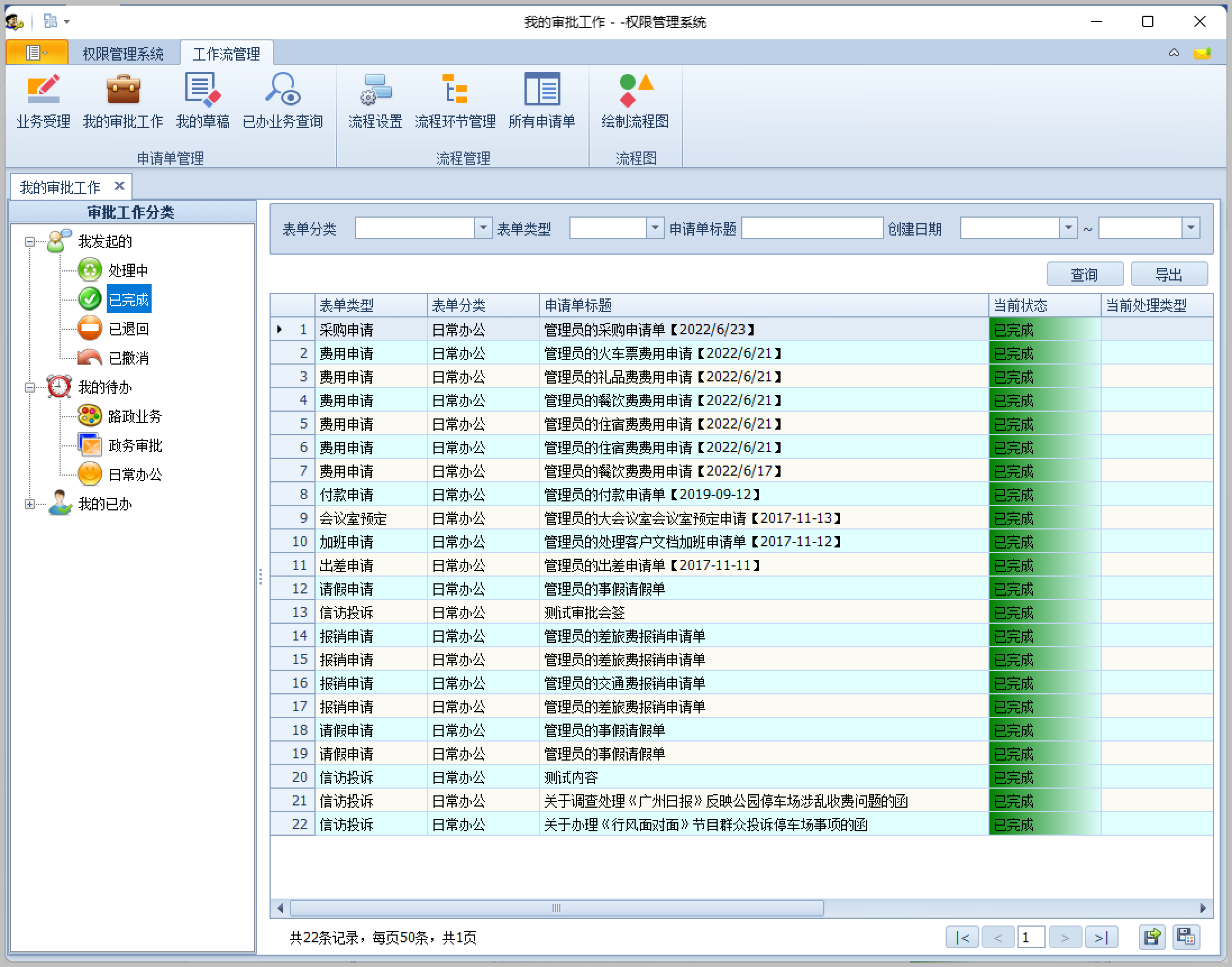 我的审批工作,包括【我发起的】、【我的待办】、【我的已办】几类大项,并可以根据查询条件进行过滤列表,界面如下所示: