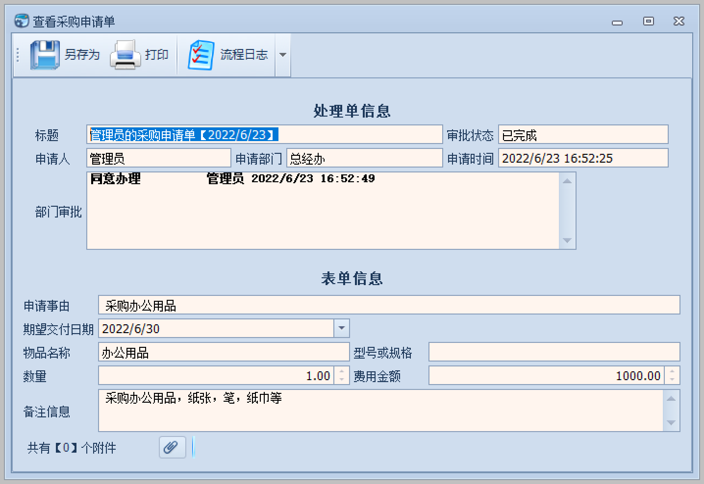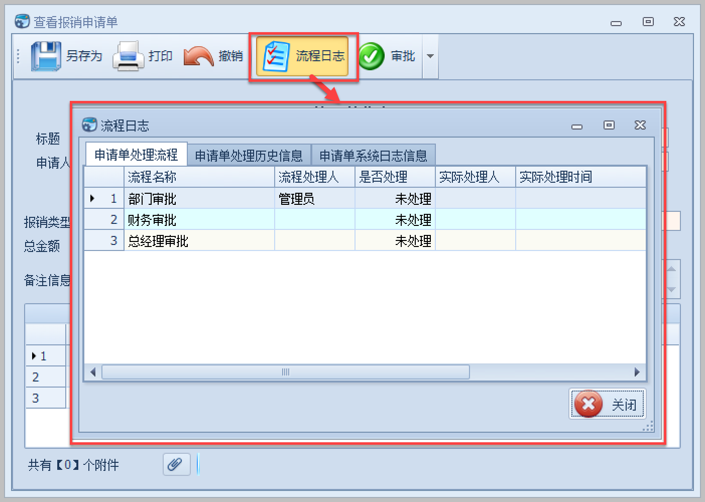 如果需了解申请单的流程日志信息,单击【流程日志】按钮,弹出申请单的相关日志信息,如下界面所示。