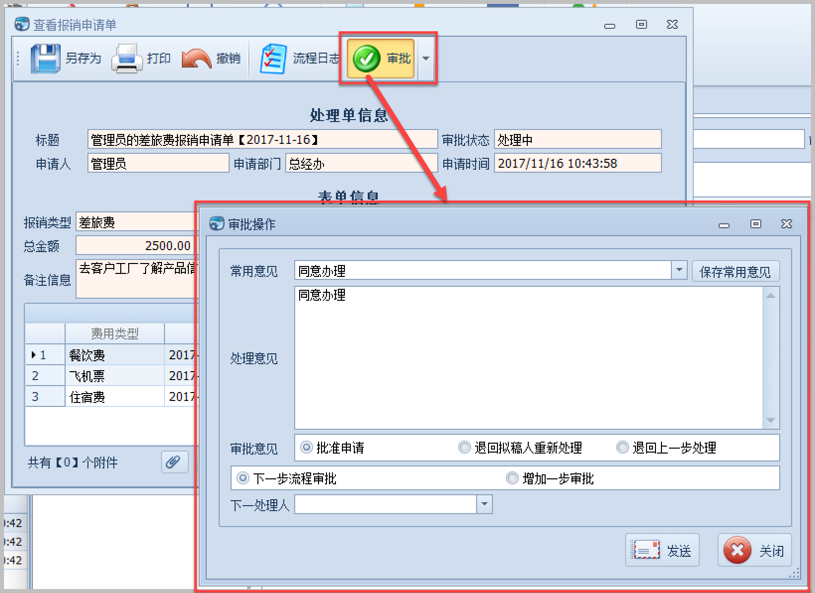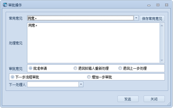 如果审批单可以进行审批处理,则会出现相关的审批按钮,单击【审批】按钮,弹出审批对话框,可以录入相关的审批意见,如下界面所示。