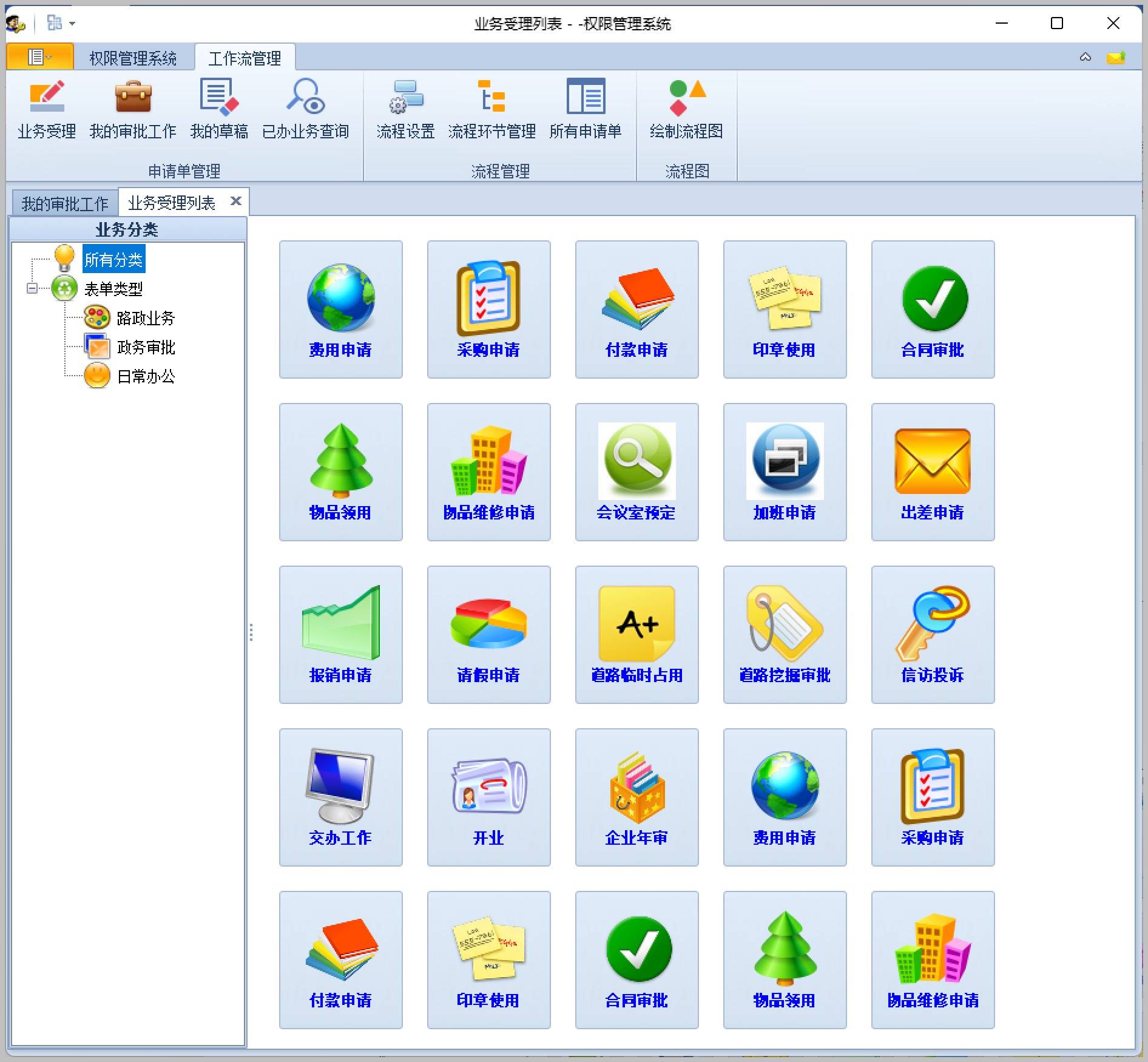 前面介绍过的工作流的业务受理列表,展示的是可以创建申请单的图形按钮列表,如下界面所示的效果列表。