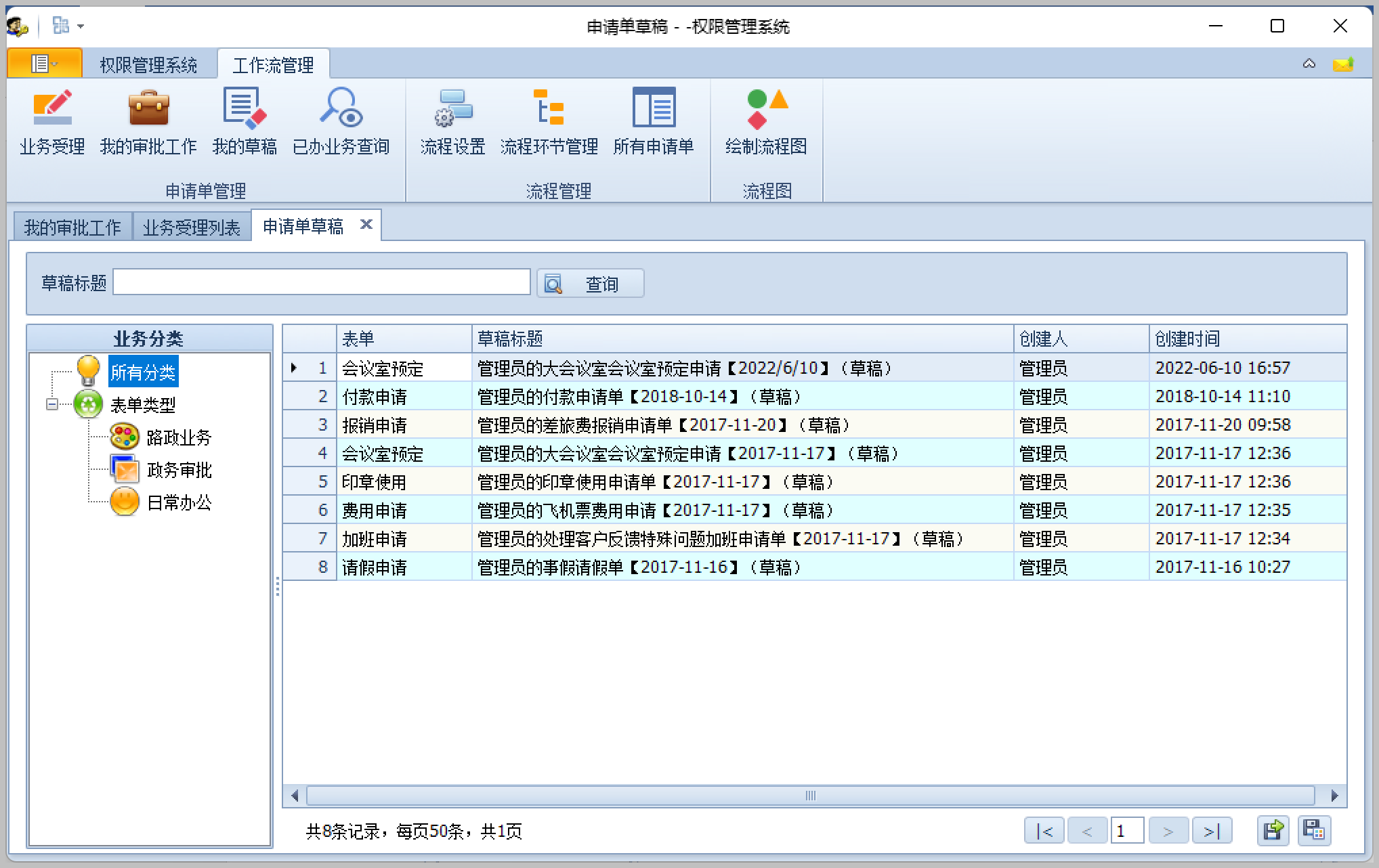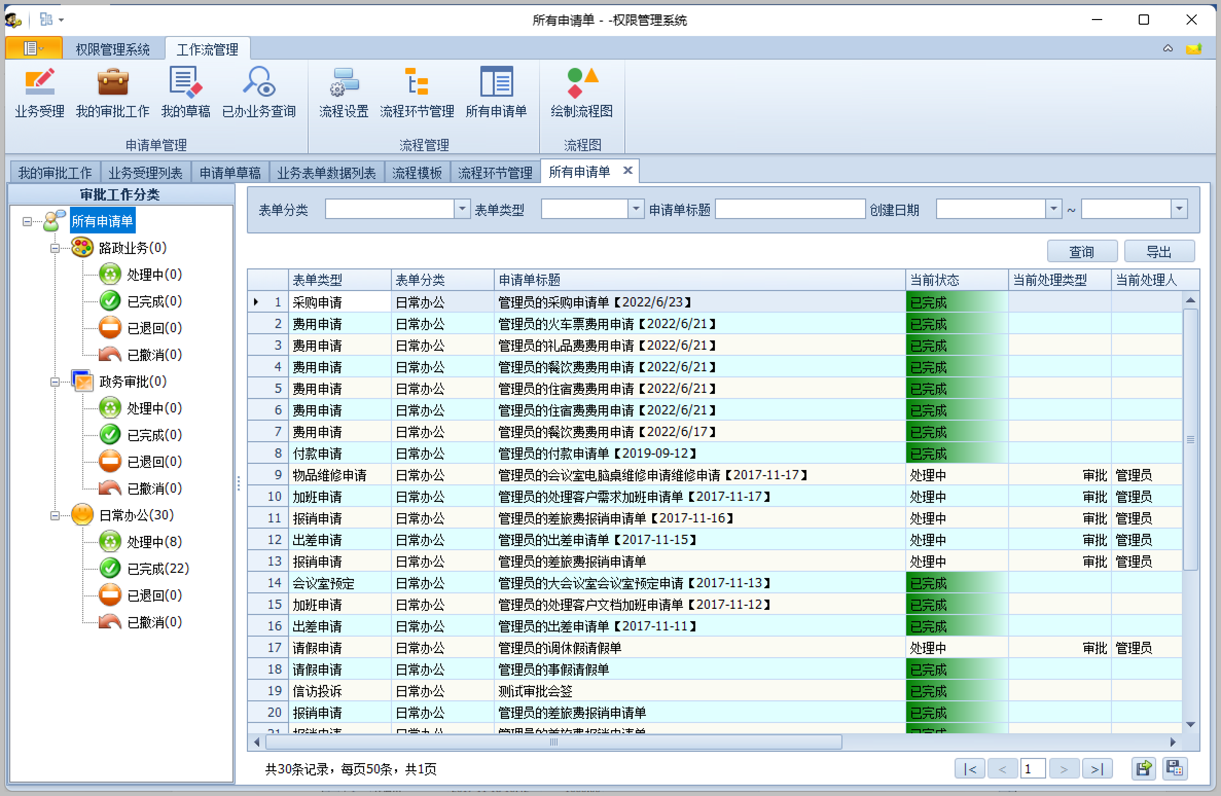 所有申请单列出工作流系统中的所有流程表单的信息,便于管理员针对性的查找申请单信息进行调整处理。