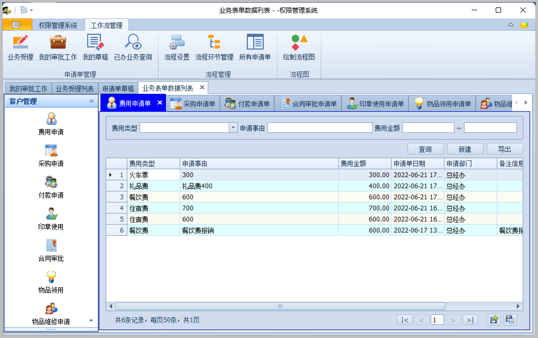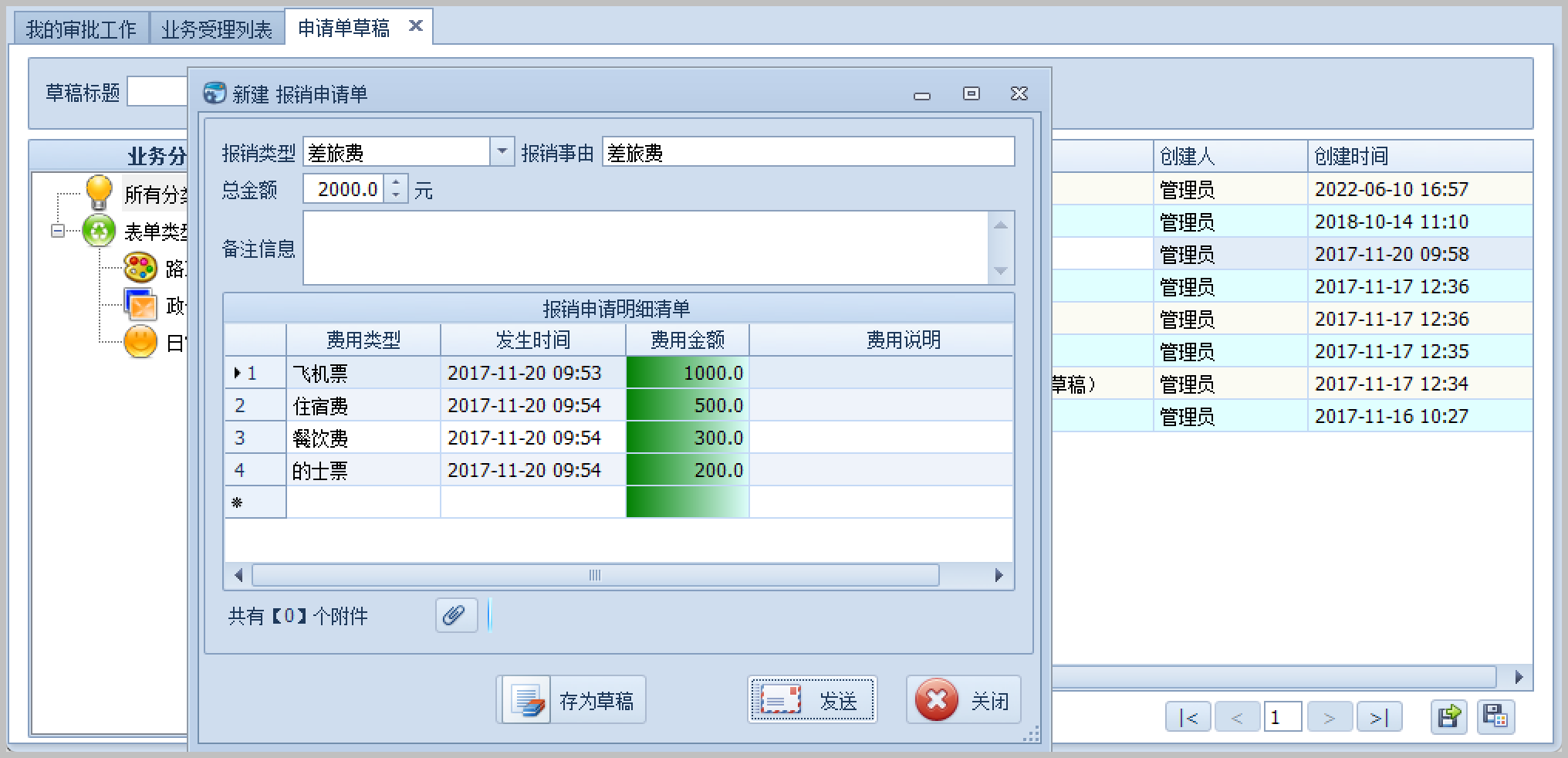 我们可以根据左侧树列表的业务分类进行过滤,展示不同分类的申请单。单击其中图形按钮,可以创建一个新的申请单,申请单界面如下所示。