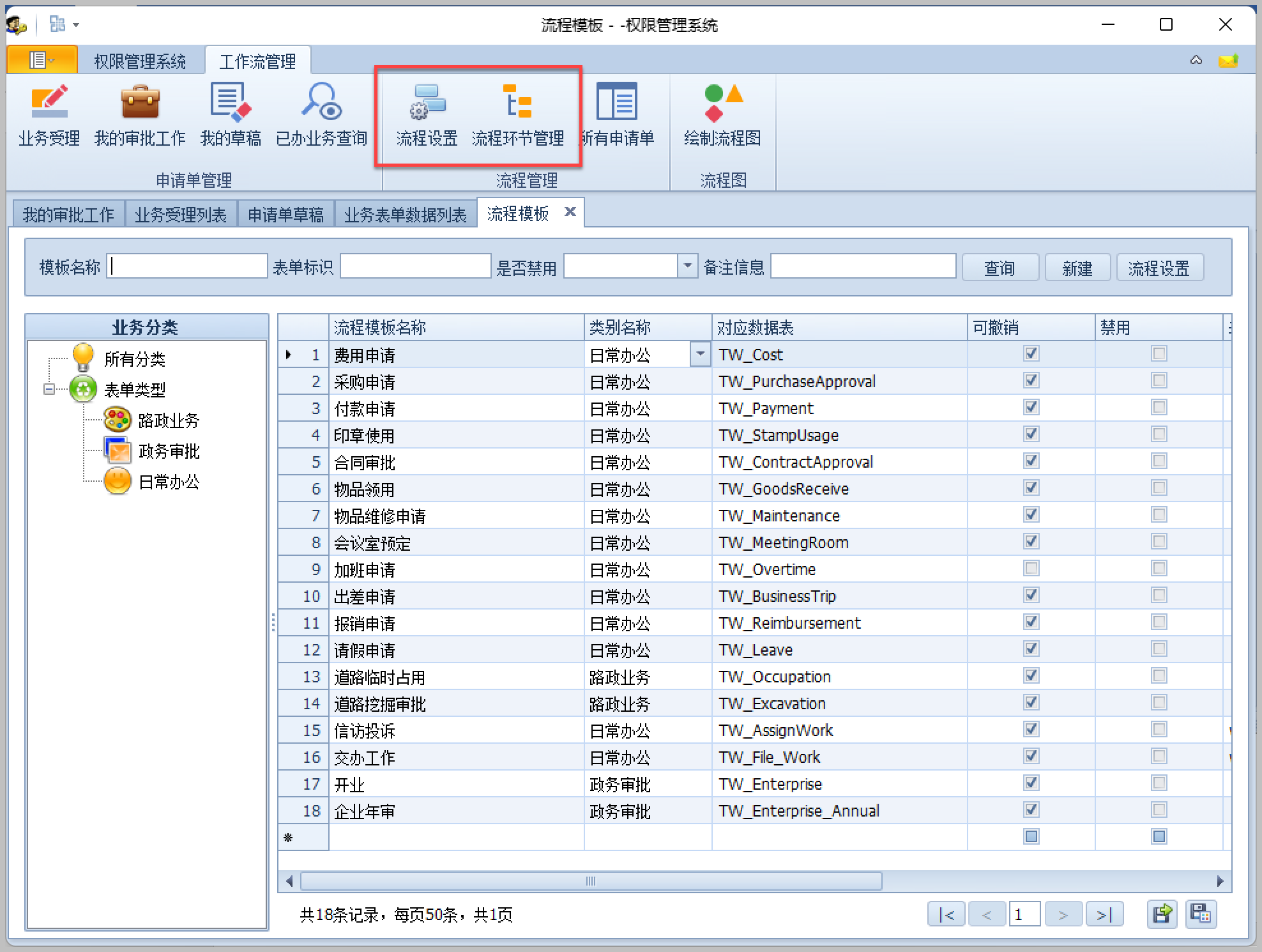 其中的数据就是在这个流程模板中配置管理的,流程模板中管理工作流业务中可以使用的申请单配置信息,流程模板界面如下所示。