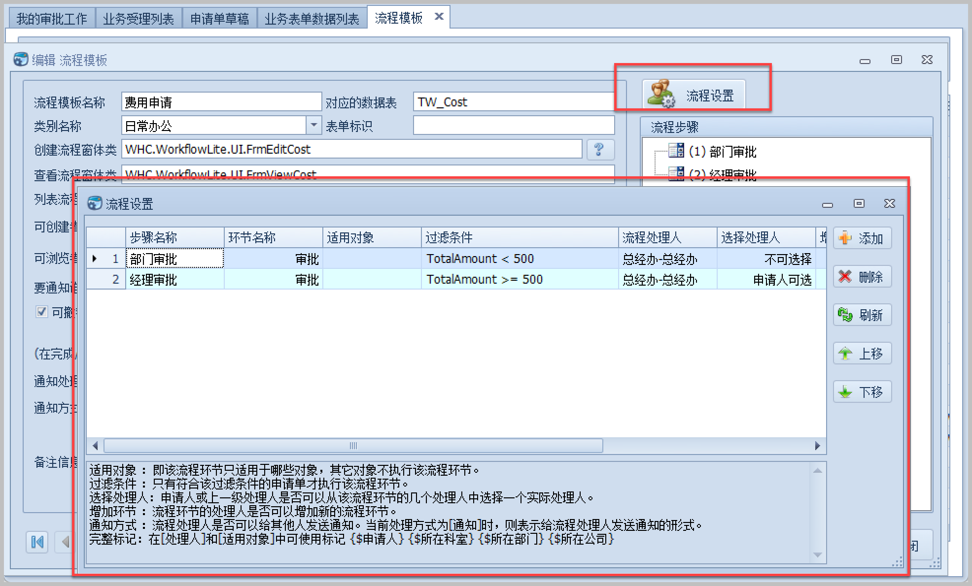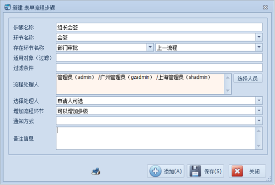 单击【流程设置】,可以设置该申请单模板的流程步骤,如下界面所示。