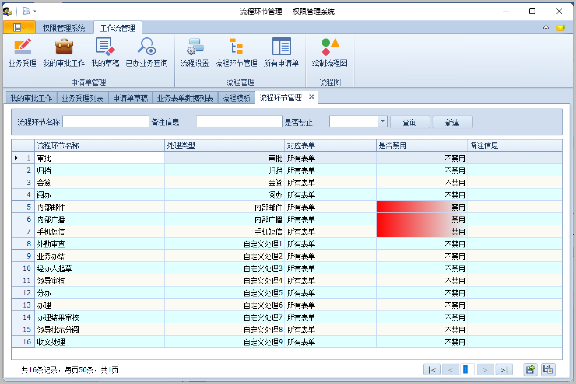 流程环节管理,是定义系统工作流中用到的流程环节类型(处理类型)信息,如下界面所示。