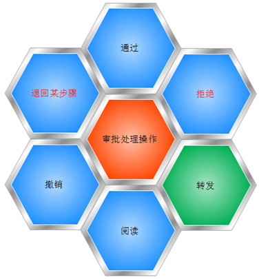 对于一个流程处理操作,我们知道一般有审批通过、拒绝、退回到某步骤、转发到内部阅读、阅读,以及包括起草者能撤销表单呢等操作,当然如果还有一些具体的业务,可能还会有一些流程的处理才操作,不过基本上也可以归结为上面几种,只是他们每步处理的数据内容不同而已。因此审批的操作步骤分类如下所示。