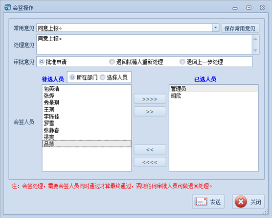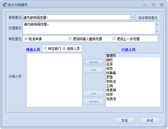 以及传递给内部人员进行分阅操作,那么就应该选定多个人员进行处理,大概的处理界面效果如下所示。
