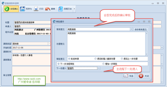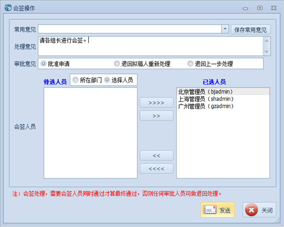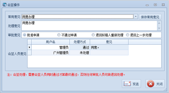 上面的界面是审批过程中,对于某一个流程处理人员实现的操作,而有时候,我们可能需要针对多个人进行某个步骤的处理,如会签处理,会签处理处理界面效果如下所示。