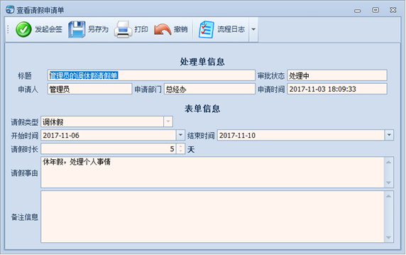 我们创建一个请假申请单,用来发起会签处理,介绍会签的步骤说明。