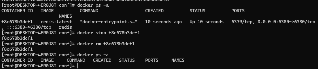 [root@DESKTOP-4ER0J8T conf]# docker rm {CONTAINER ID || 名字NAMES}