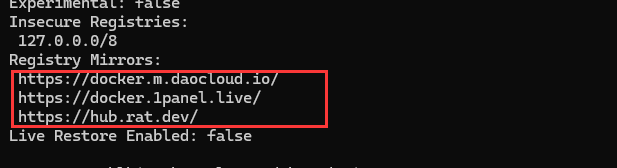 "registry-mirrors": ["https://docker.m.daocloud.io","https://docker.1panel.live","https://hub.rat.dev"]