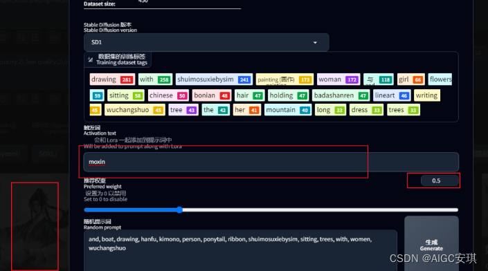 点击lora图片上的图标,可在弹出窗口页面维护触发词和权重,下次使用时可自动带出。