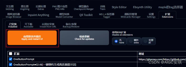 安装完后点击重启webui进行革新,插件安装准确就会出现在已安装列表中。