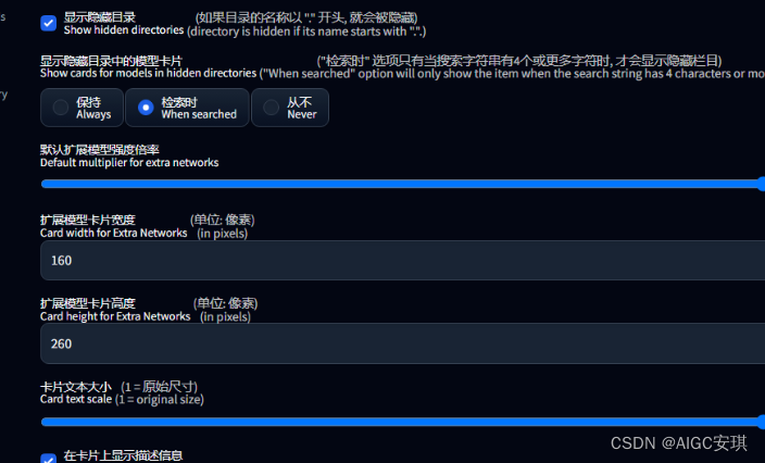 在设置——扩展模子中,可以设置一些细节。比如设置模子展示方式是卡牌照旧缩略图,卡牌宽高尺寸、LORA模子加载权重等等。