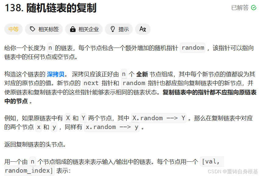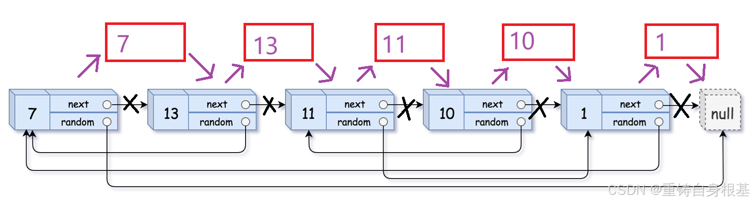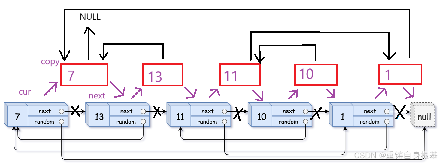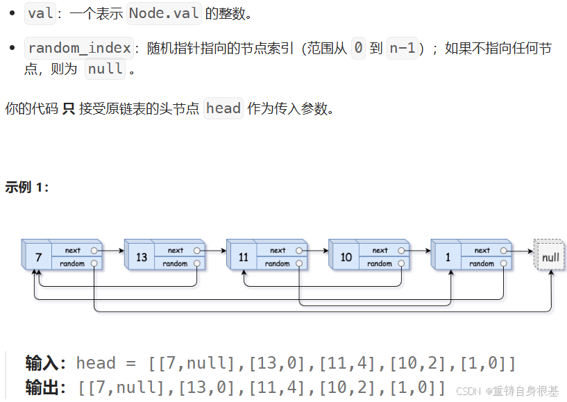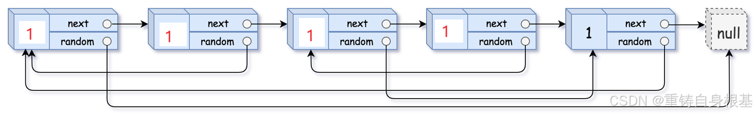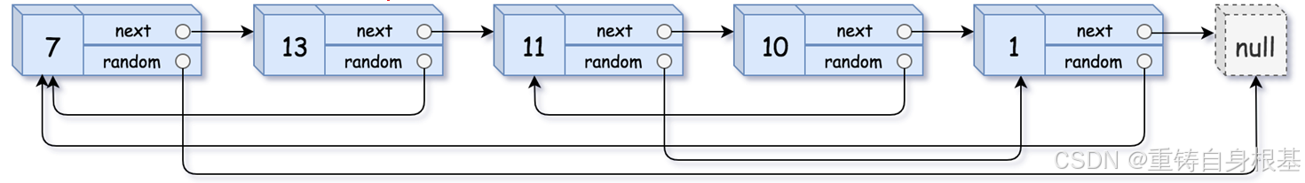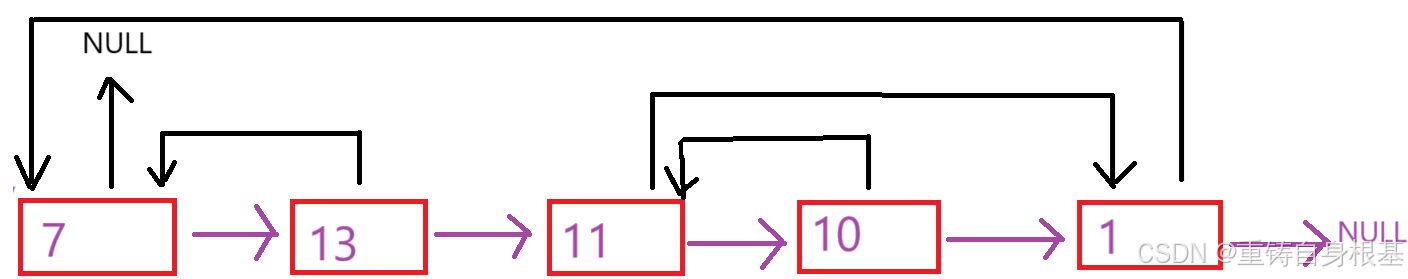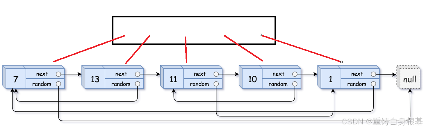 该标题的随机链表与我们常规的单链表的构造不同,单链表的讲解请点击<—,除了有指向下一个节点的指针外,还有一个指针可以指向该链表的恣意位置包括空NULL