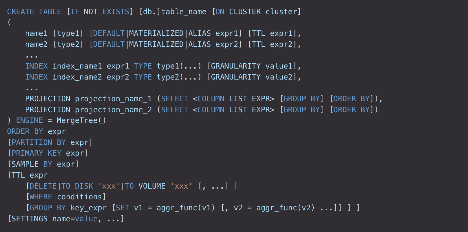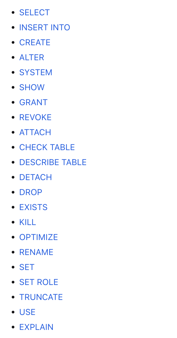 ClickHouse支持的SQL语句如上所示,内容太多了。。只简单挑些重点看下,先留个坑。