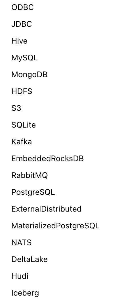 正如上面提到的ClickHouse对mysql等数据库的"支持",实际上在表引擎上也提供了与外部系统的多种集成方式,如下所示。具体不再介绍,有需要可以去官网了解。