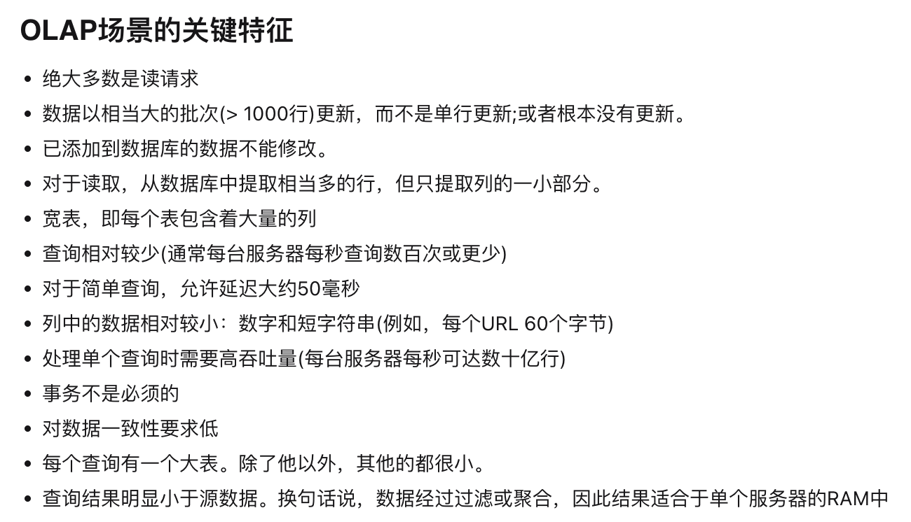上图截自ClickHouse官方文档,与其说这是olap的场景,不妨说是ClickHouse的常见场景。其中我觉得有必要指出的是:
