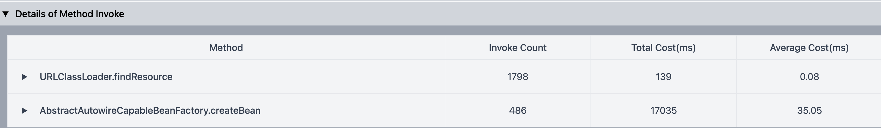 方法调用的详细信息。这里统计了每个方法的调用时间、总时间开销和每次调用的平均时间