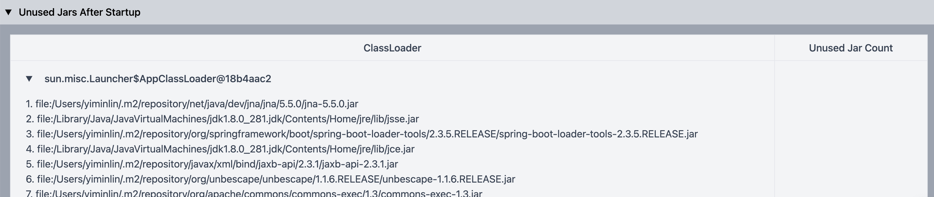 启动后未使用的JAR。列出了所有Spring应用启动后没有使用的jar包,可以有效的帮助你清理不需要的依赖,为应用瘦身