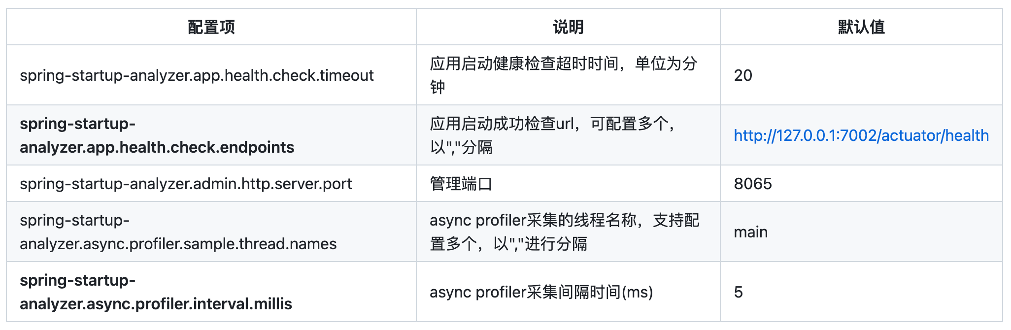 配置分析工具的参数,这里根据自己需要添加即可,比如可以配置超时时间30分钟:-Dspring-startup-analyzer.app.health.check.timeout=30,其他可配置项如下表,你可以工具自己应用的情况去修改: