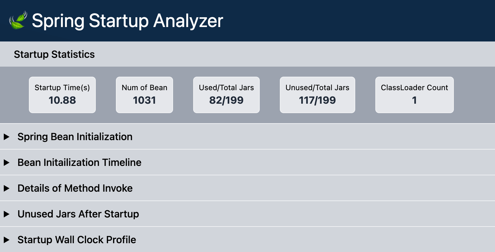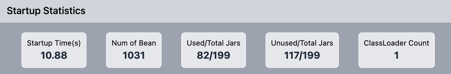 启动的统计数据。其中包括:启动时间、Bean的数量、使用/总共的JAR包数量、未使用/总共的JAR包数量、ClassLoader数量