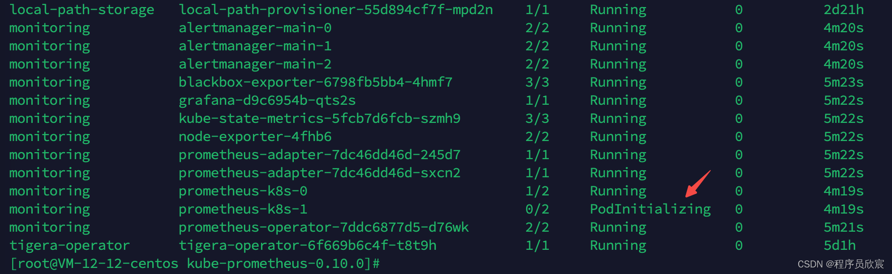 查看pod情况,如下图,大部分pod创建得很快,也有一两个稍微慢一点的,实测两三分钟可以全部ready
