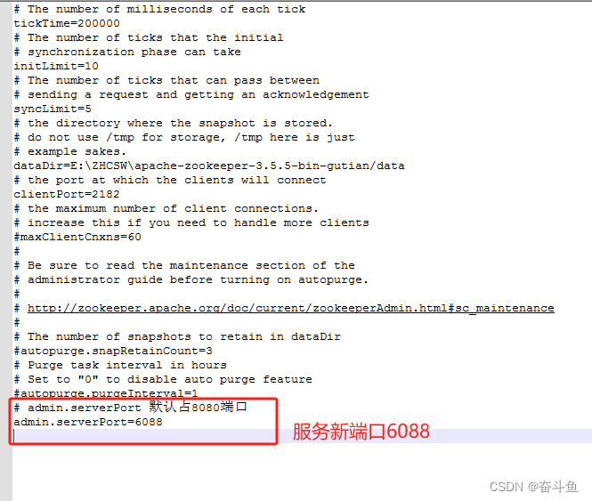 修改端口的方法是,打开设置文件zoo.cfg,在文件末行添加以下内容