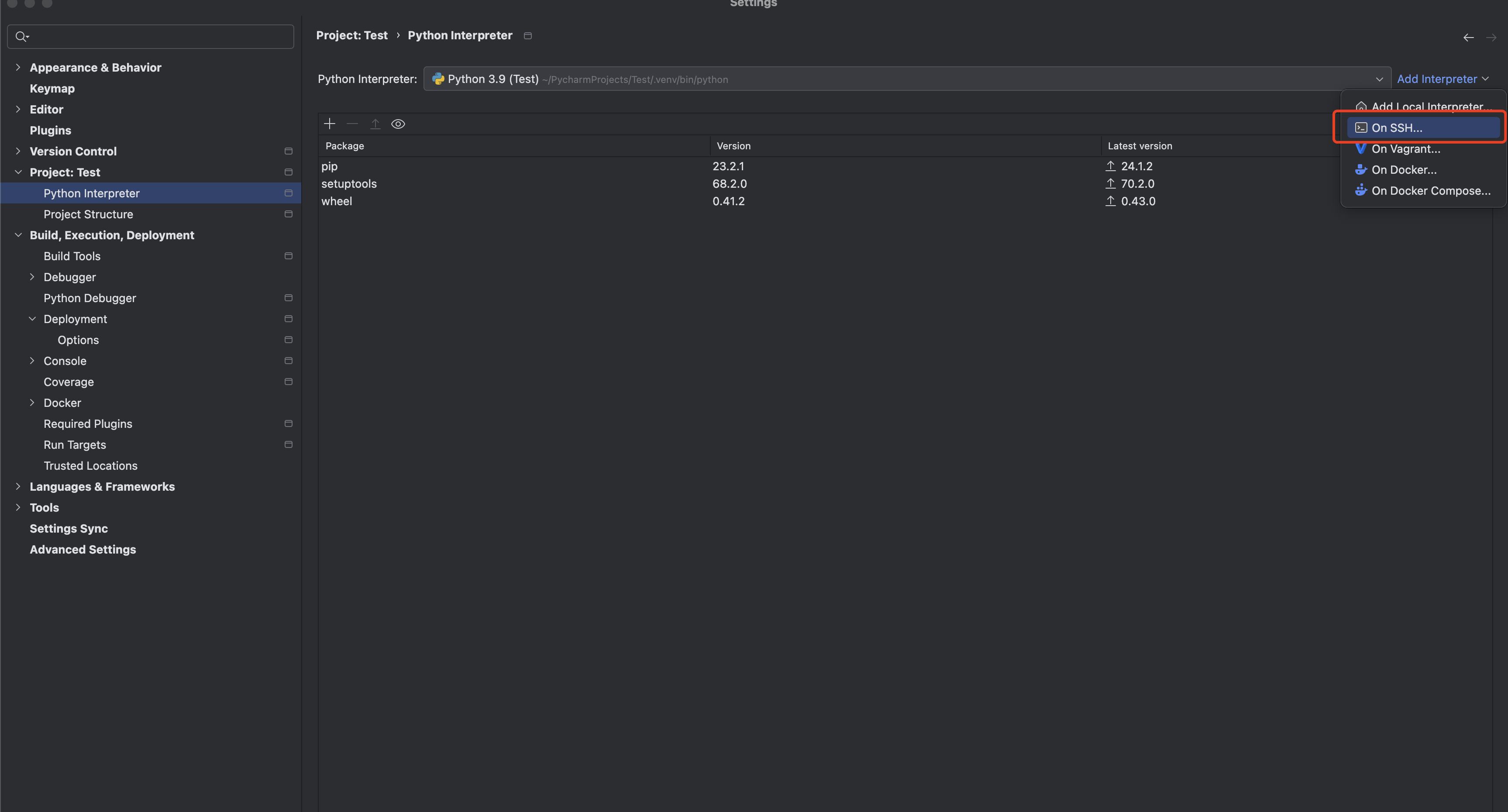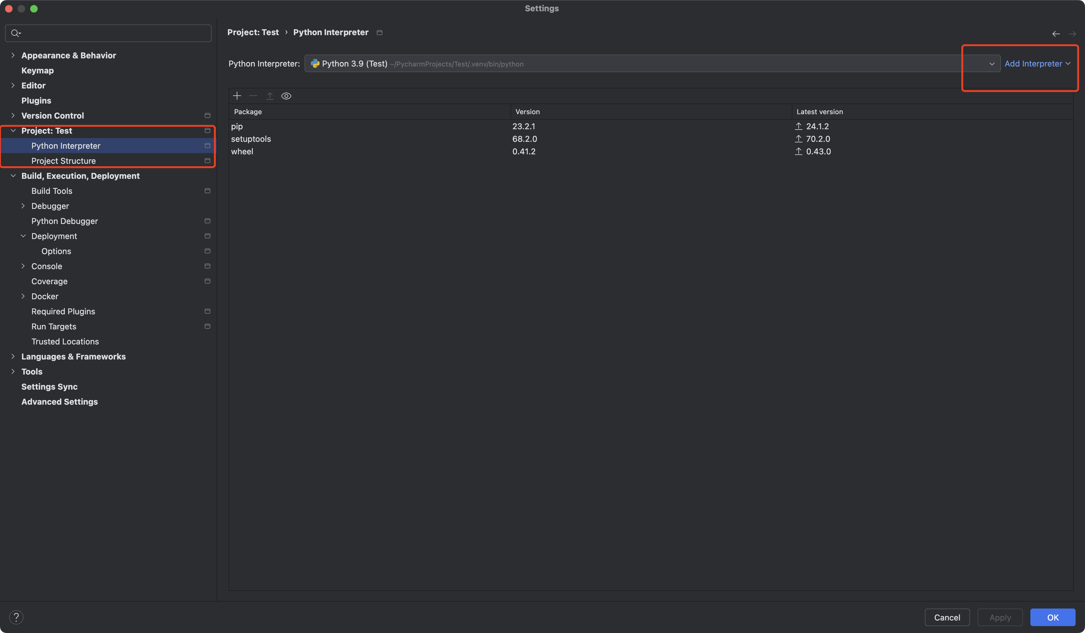 同样在设置中找到Python Interpreter,点击右上角Add Interpreter.