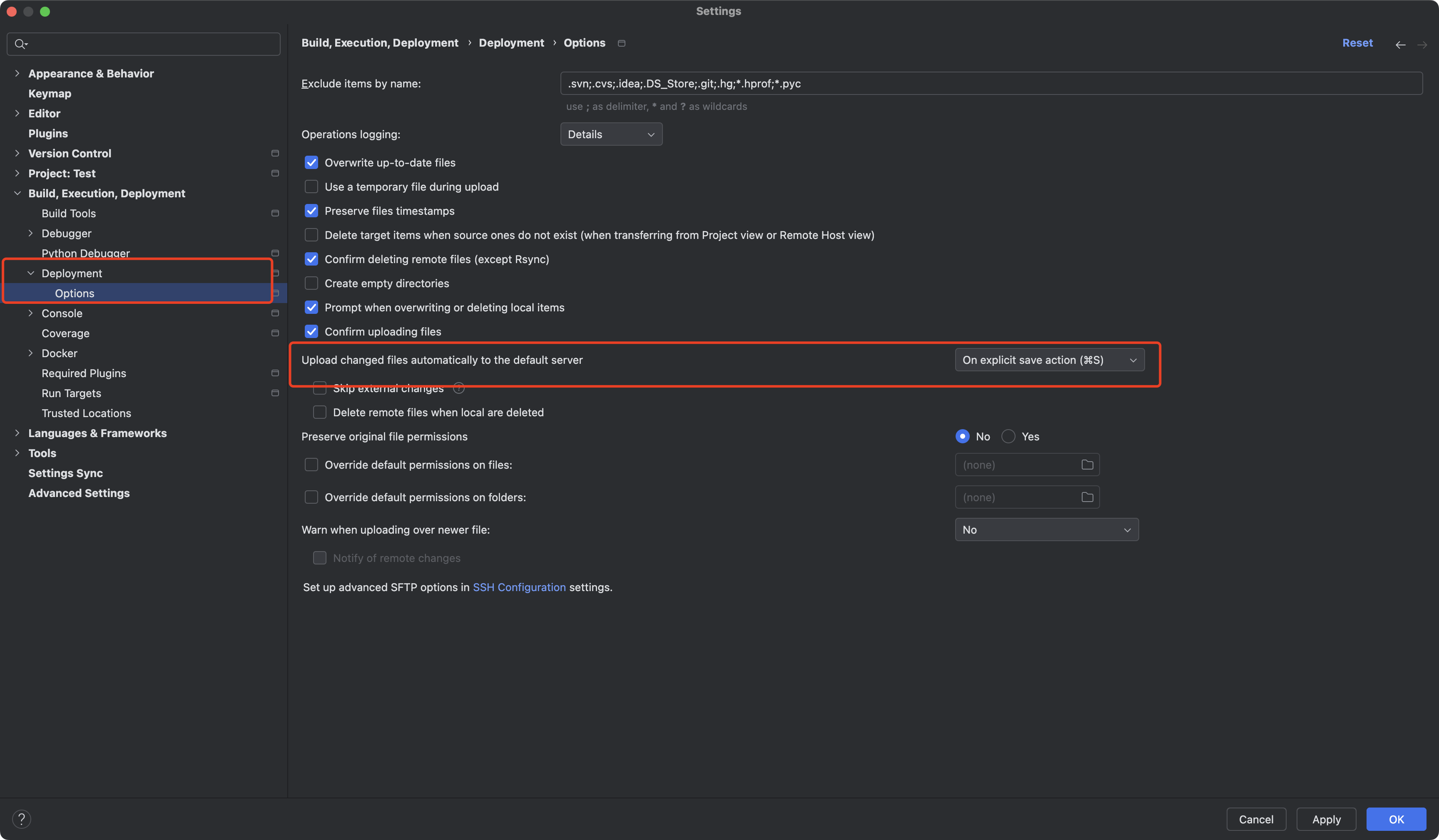 在Upload changed files automatically to the default server这一栏中选择生存主动上传,固然也可以根据本身的需求选择主动上传(always)。设置完之后apply-ok即可。