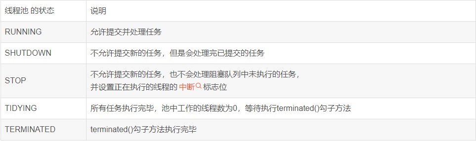 注:SHUTDOWN 状态 和 STOP 状态 先会转变为 TIDYING 状态,最终都会变为 TERMINATED2、ThreadPoolExecutor构造函数: