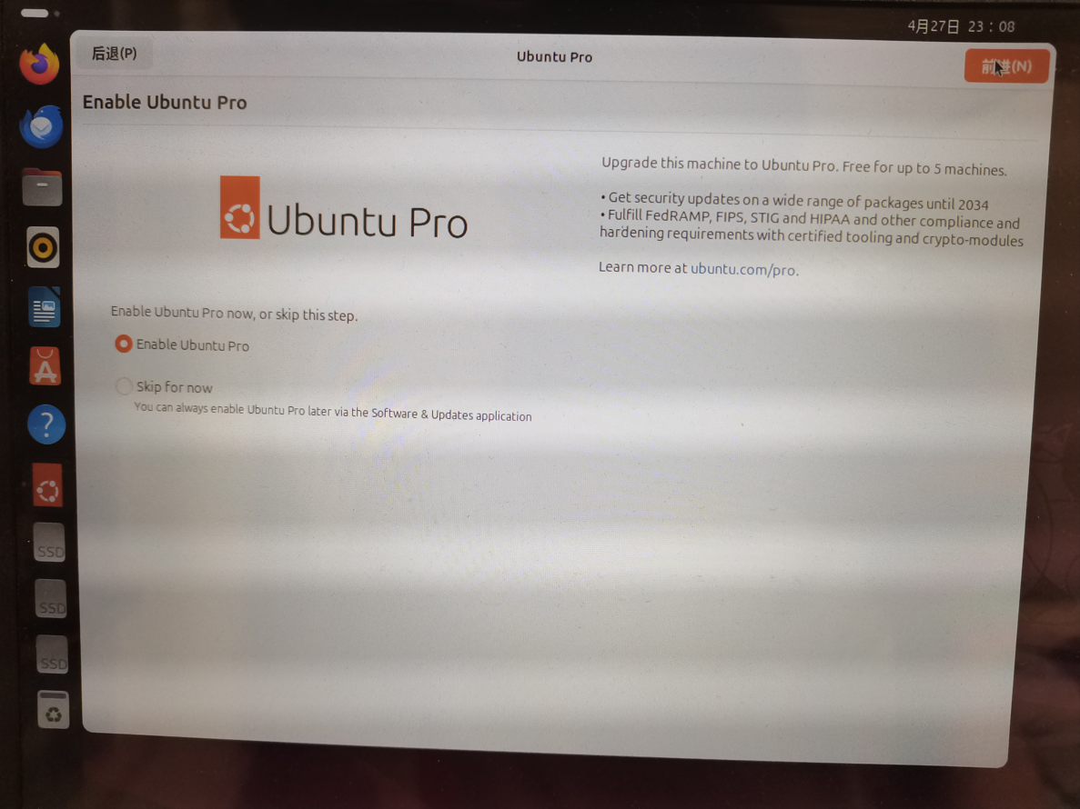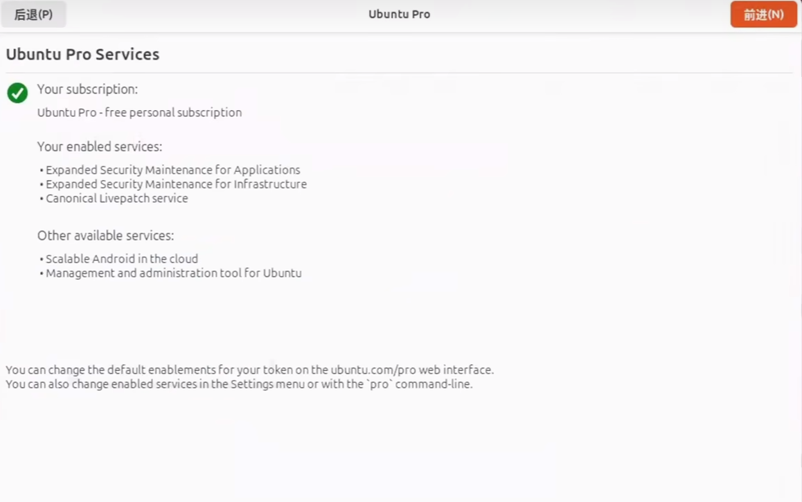 欢迎页点击前进进入是否升级Ubuntu Pro的页面,勾选Enable Ubunu后点击前进。