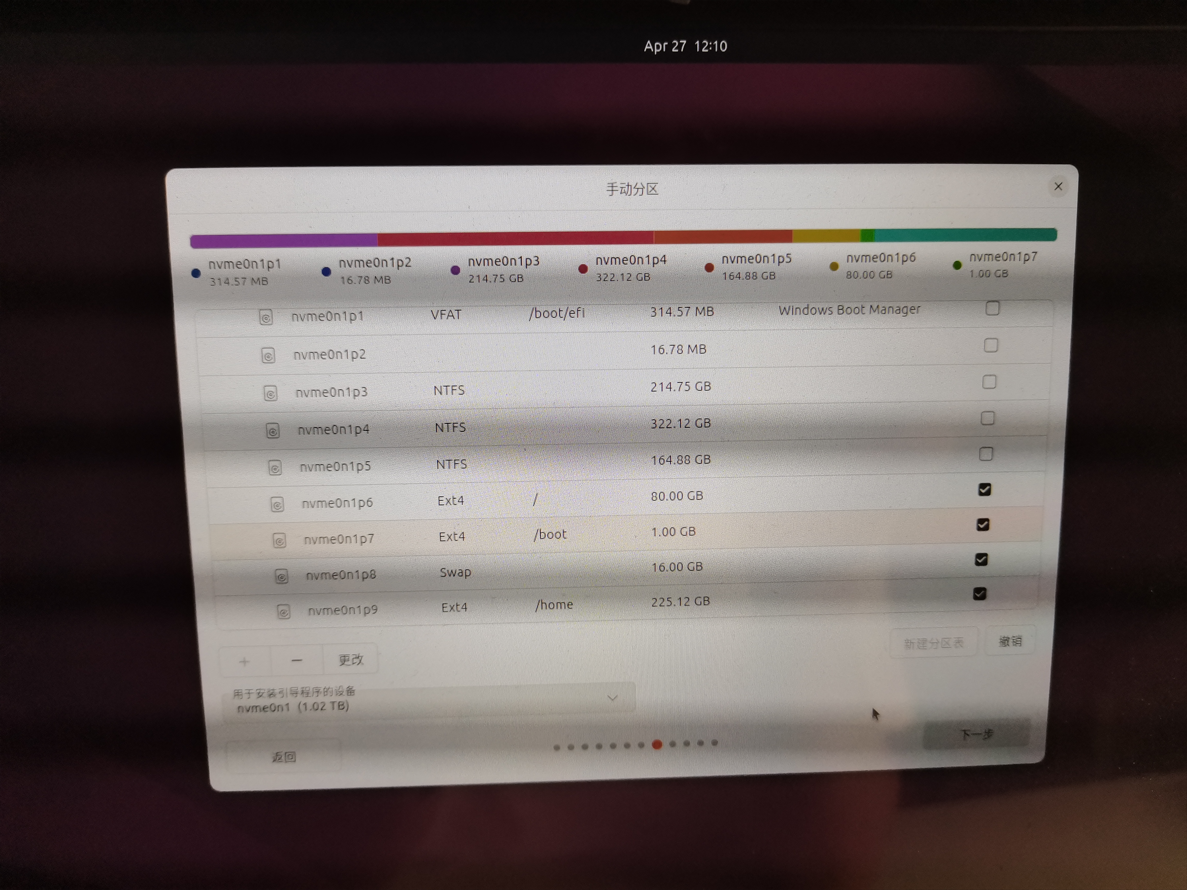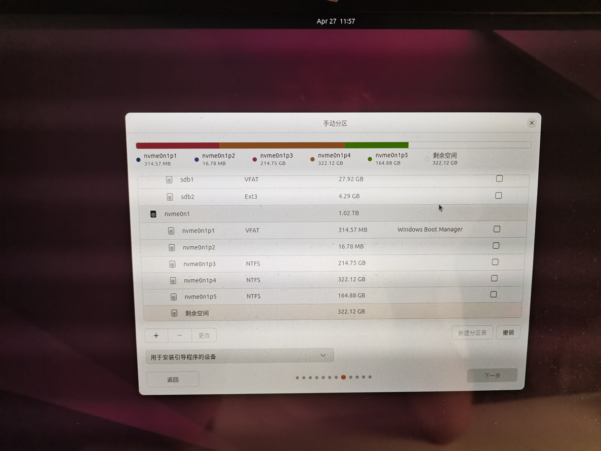 进入手动分区页面后,选择上文中预留300G空间地点的磁盘,我是选择nvme0n1中的322.12G剩余空间。