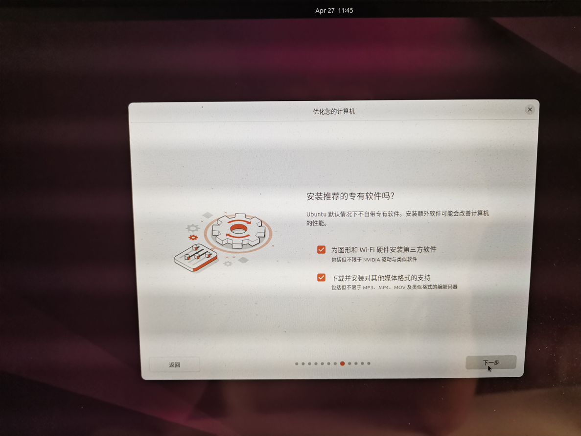 安装额外软件:勾选为图像和WiFi硬件安装第三方软件、下载并安装对其他媒体格式的支持,点击下一步。