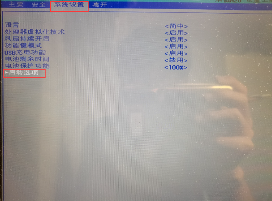 插入U盘,关机重启,进入BIOS界面;点击体系设置栏,展开启动选项。