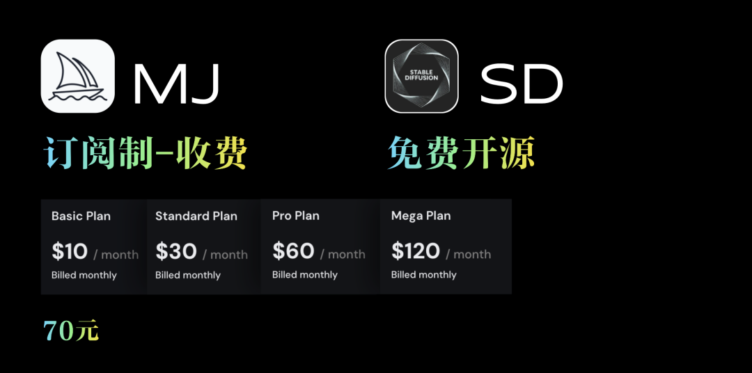 MJ是收费的,按年大概按月收取会员费。最低一个月10美金,最高一个月120元美金。有4个差别的档位,对应着差别的套餐。最低套餐一个月大概70元,多人拼车,代价更低。而SD是完全开源免费的,非常良心。