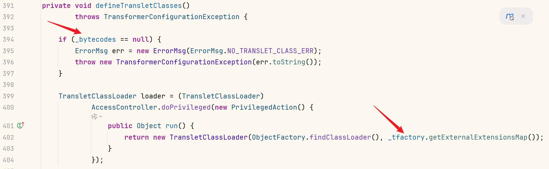 接着进入defineTransletClasses,如果_bytecode为空会报此 Templates 不包罗有用的 translet 类界说的错误,如果_tfactory为为null步伐会直接返回。