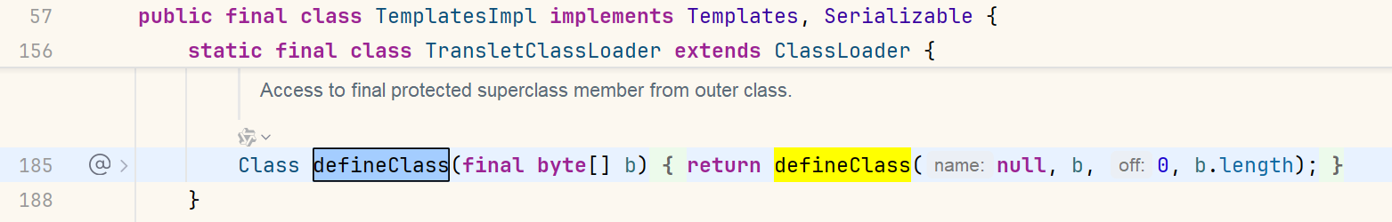 defineClass可以加载字节码,但由于defineClass的作用域是protected,所以攻击者很少能直接使用到它,但它却是我们常用的一个攻击链 TemplatesImpl 的基石。
