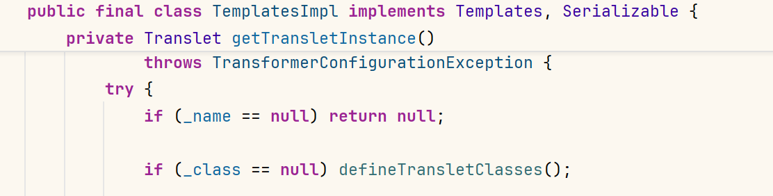 检察TemplatesImpl类的getTransletInstance方法,可以看到需要颠末两个if判定才华调用defineTransletClasses,_name需要赋一个String类型的值,_class本来就是null无需修改,我们来反射修改_name的值。