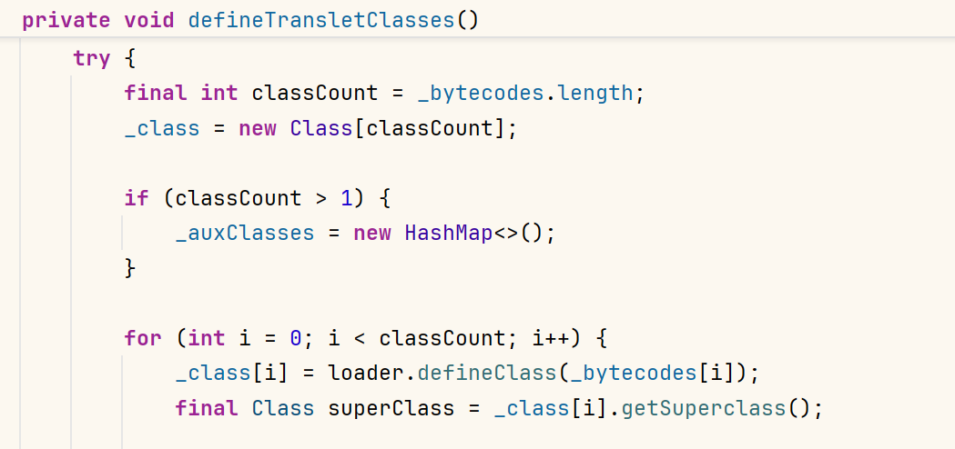 在defineTransletClasses中,加载_bytecode得到的Class对象赋给了_class