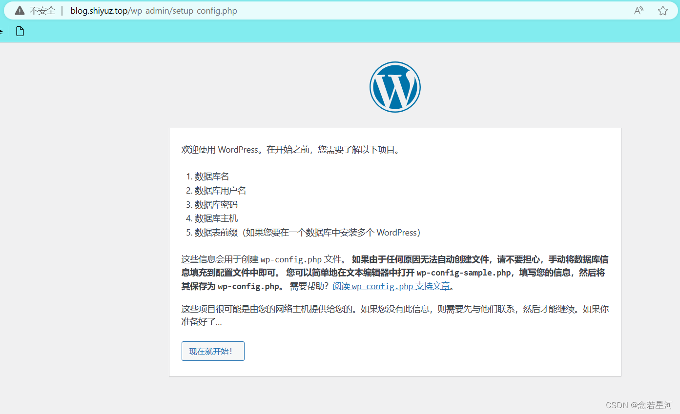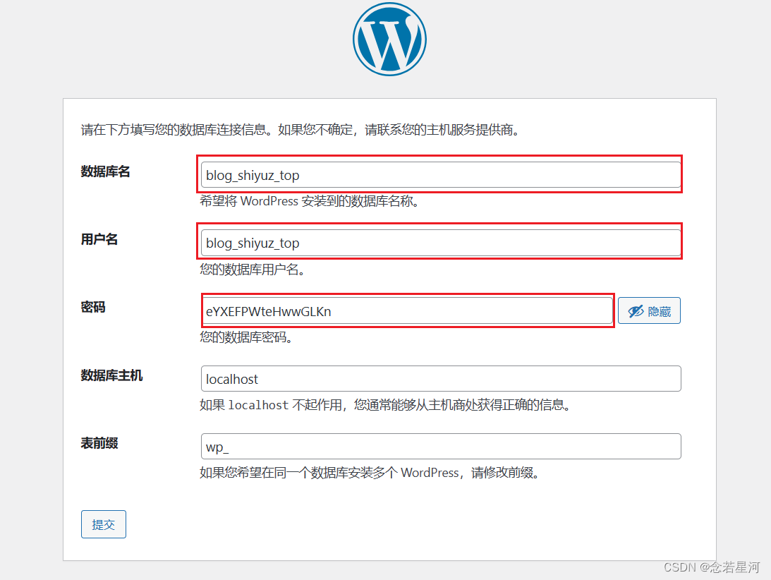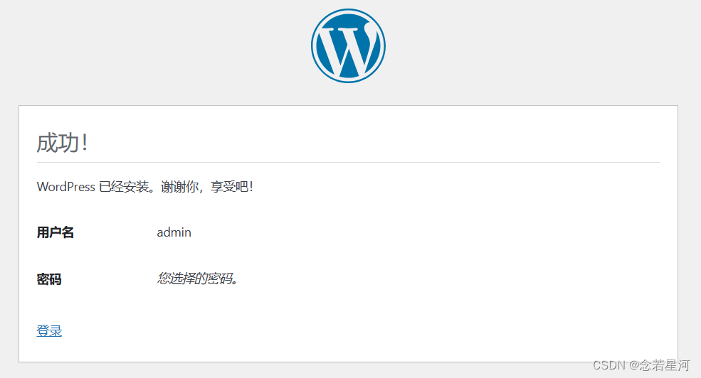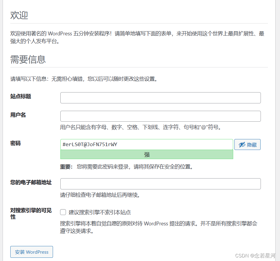 输入站点标题等干系信息,输入完成后开始安装WordPress