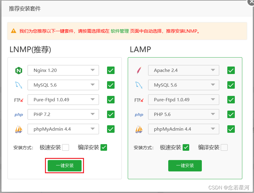 进入面板后安装须要套件,编译安装安装时间较长,也可以选择极速安装(可根据必要选择安装,最新版的WordPress必要PHP版本7.0以上)。