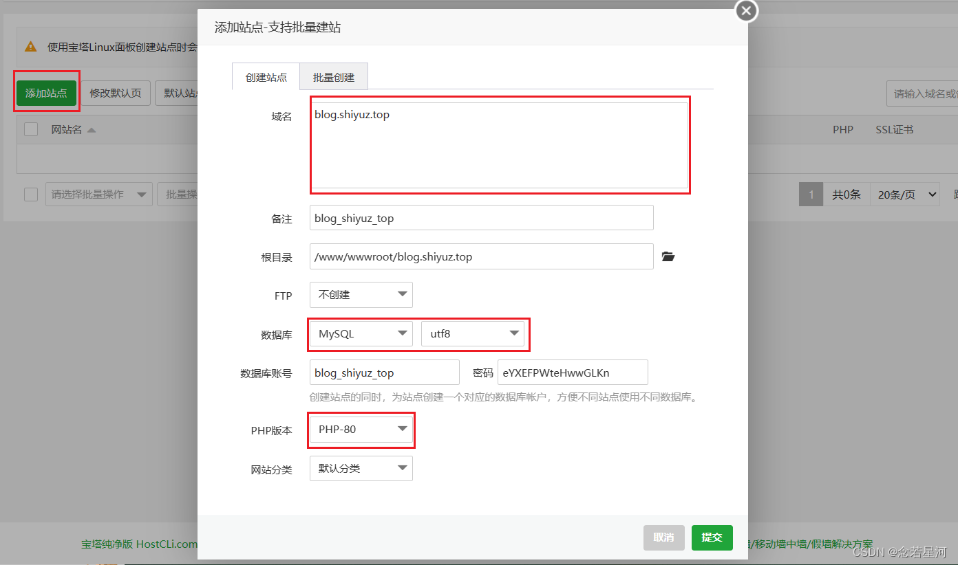 点击添加站点输入域名,数据库选择MySQL,并选择PHP版本。
