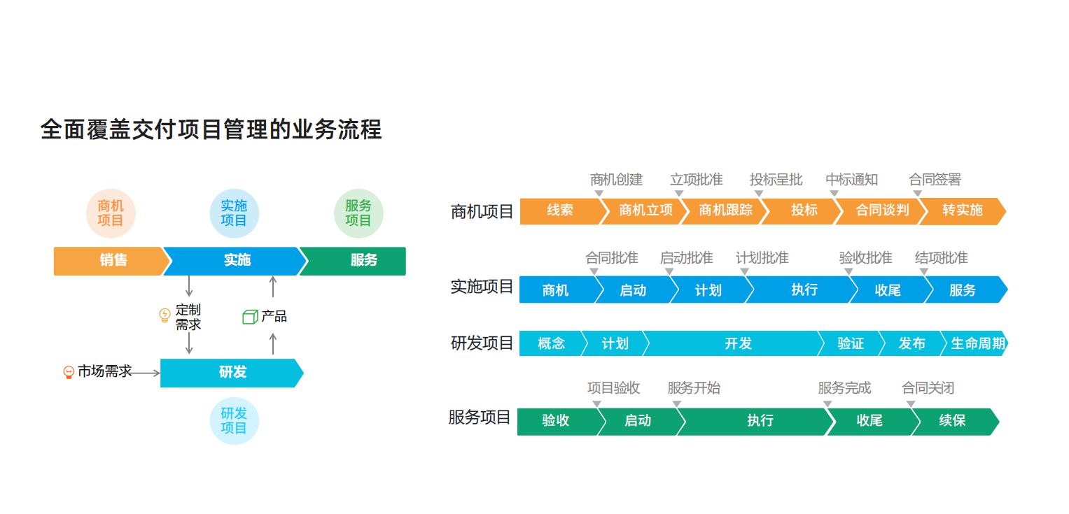 端到端的买通,促使项目状态从线索到回款全周期可见;买通部门壁垒,提升构造跨部门协作能力;确保项目按时按质交付,最终告竣业务目标。