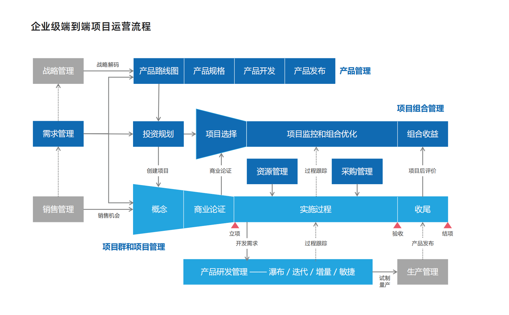 在管理方法上,覆盖敏捷开辟、传统瀑布模型及混淆式项目管理;在管理头脑上,融合PMBOK、Prince2、CMMI、IPD、APQP、精益等管理方法论。