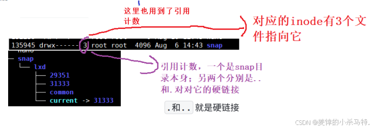 硬链接文件inode和源文件相同也就是都是指向同一个inode这就产生了引用计数: