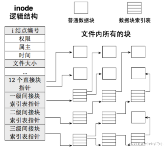实在inode布局体有一个记录它所对应的块的类似数组的东西,可以方便我们根据inode找到对应的文件数据位置;下面形象看一下: