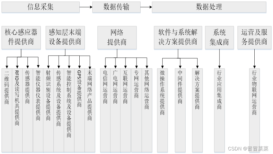 2. 完整的物联网产业链主要包罗核心感应器件提供商、感知层末了装备提供商、网络提供商、软件与行业办理方案提供商、体系集成商、运营及服务提供商等环节。