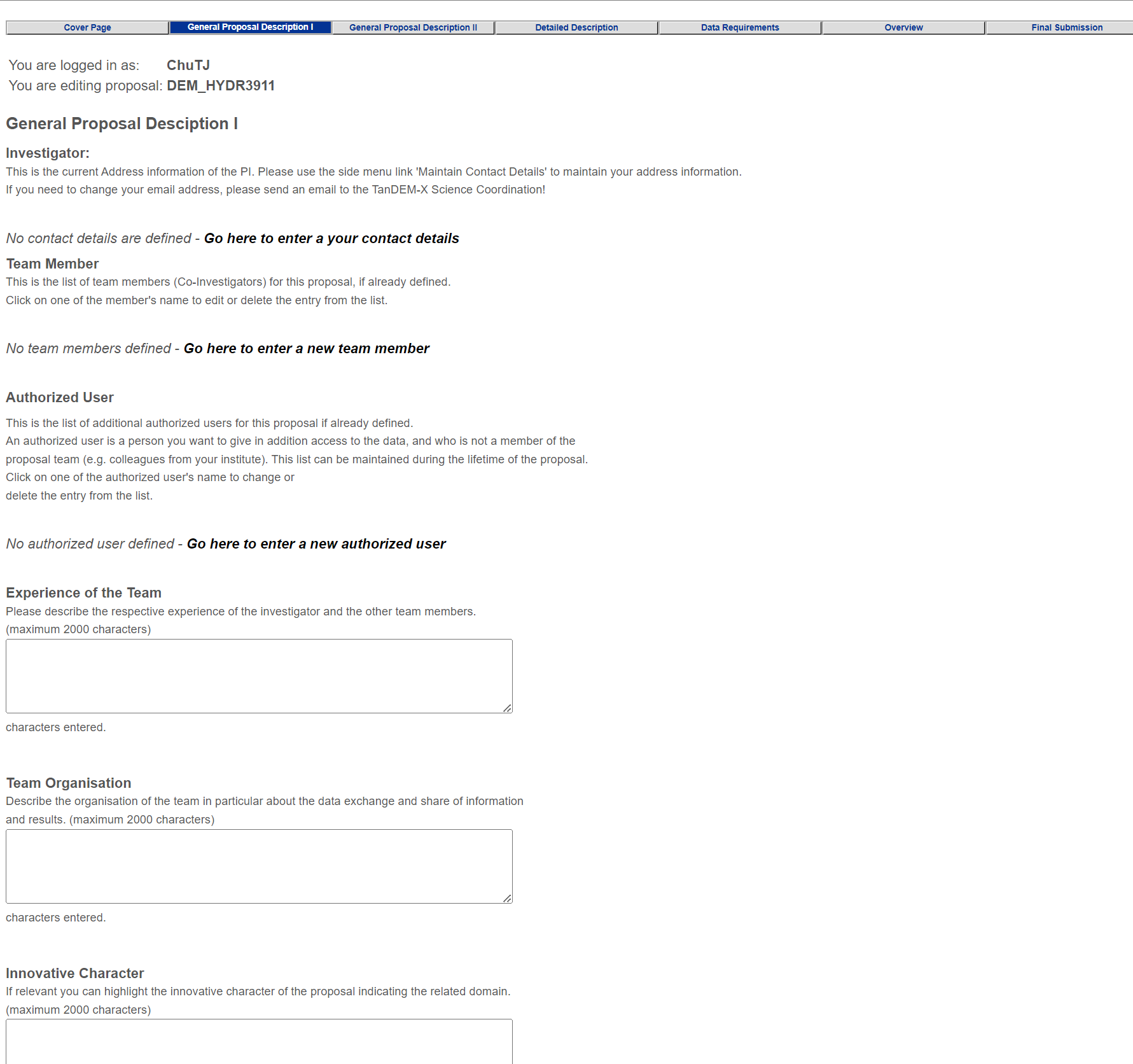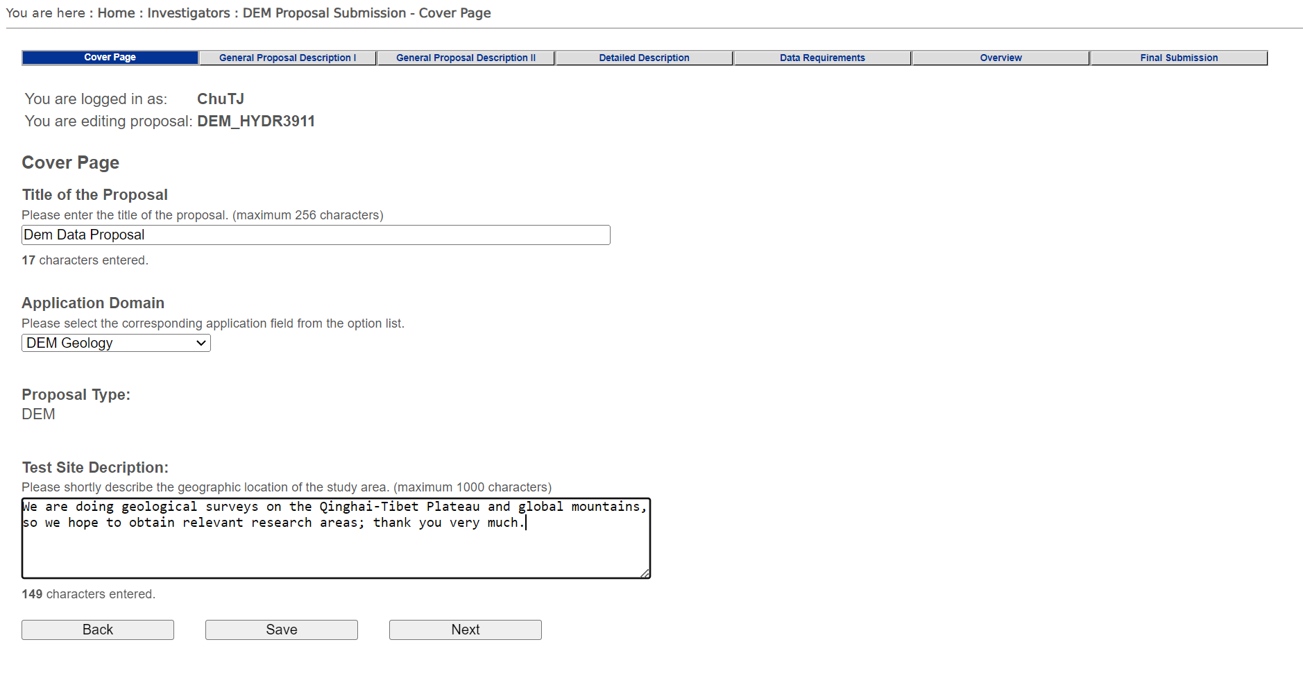 随后,即可进入申请填写界面。如下图所示,这个只是申请的第一页,后面另有大量需要填写的内容,包括我们下载数据的目的、数据研究区域介绍、所在课题组介绍等等,非常繁多。